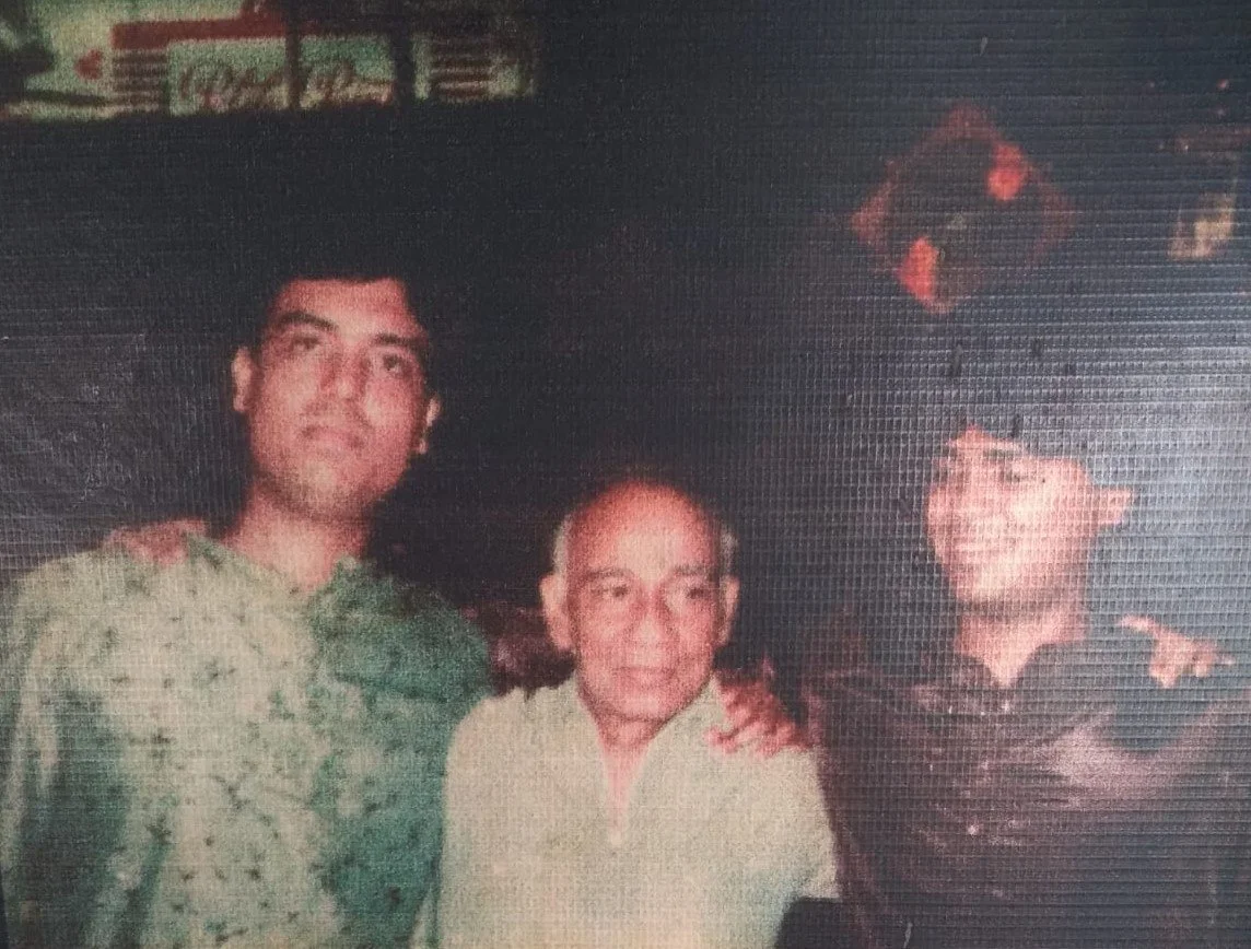 This vintage photograph captures Pandit Girish Chatterjee in his Bollywood era in Mumbai, alongside the eminent lyricist Indeevar—an ardent admirer of his singular voice—and his brother, the accomplished tabla virtuoso Ashish Chatterjee.